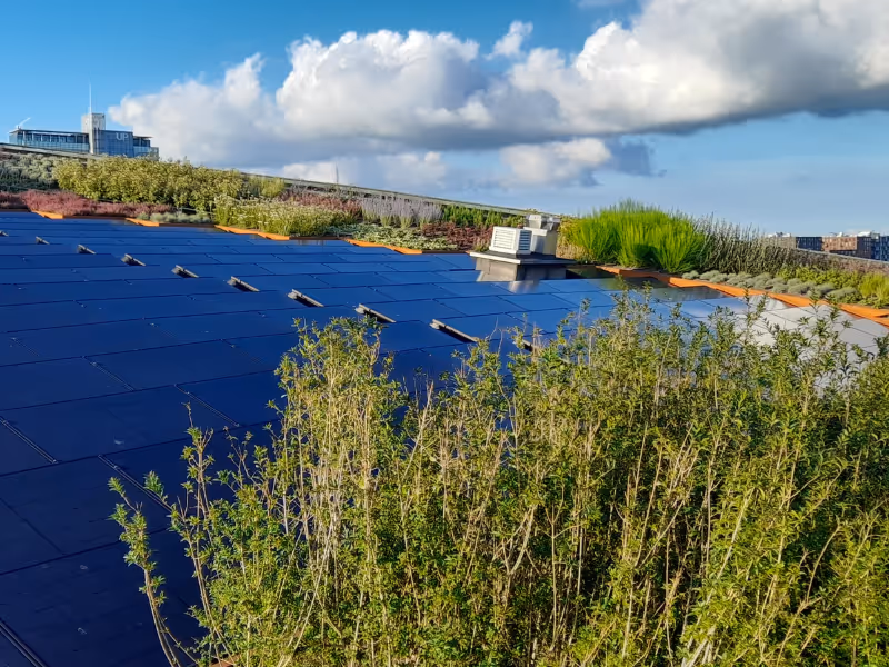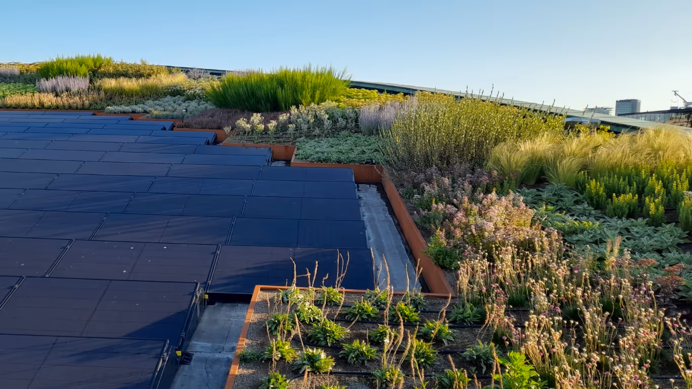 Onze zonnepanelen worden slim geïntegreerd met groendaken en waterberging - één systeem dat ruimte bespaart, beter presteert en zichtbaar duurzaam is.